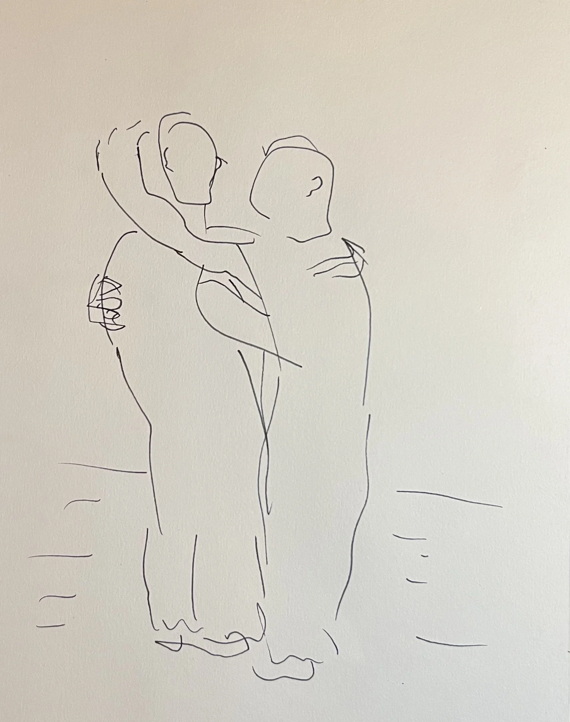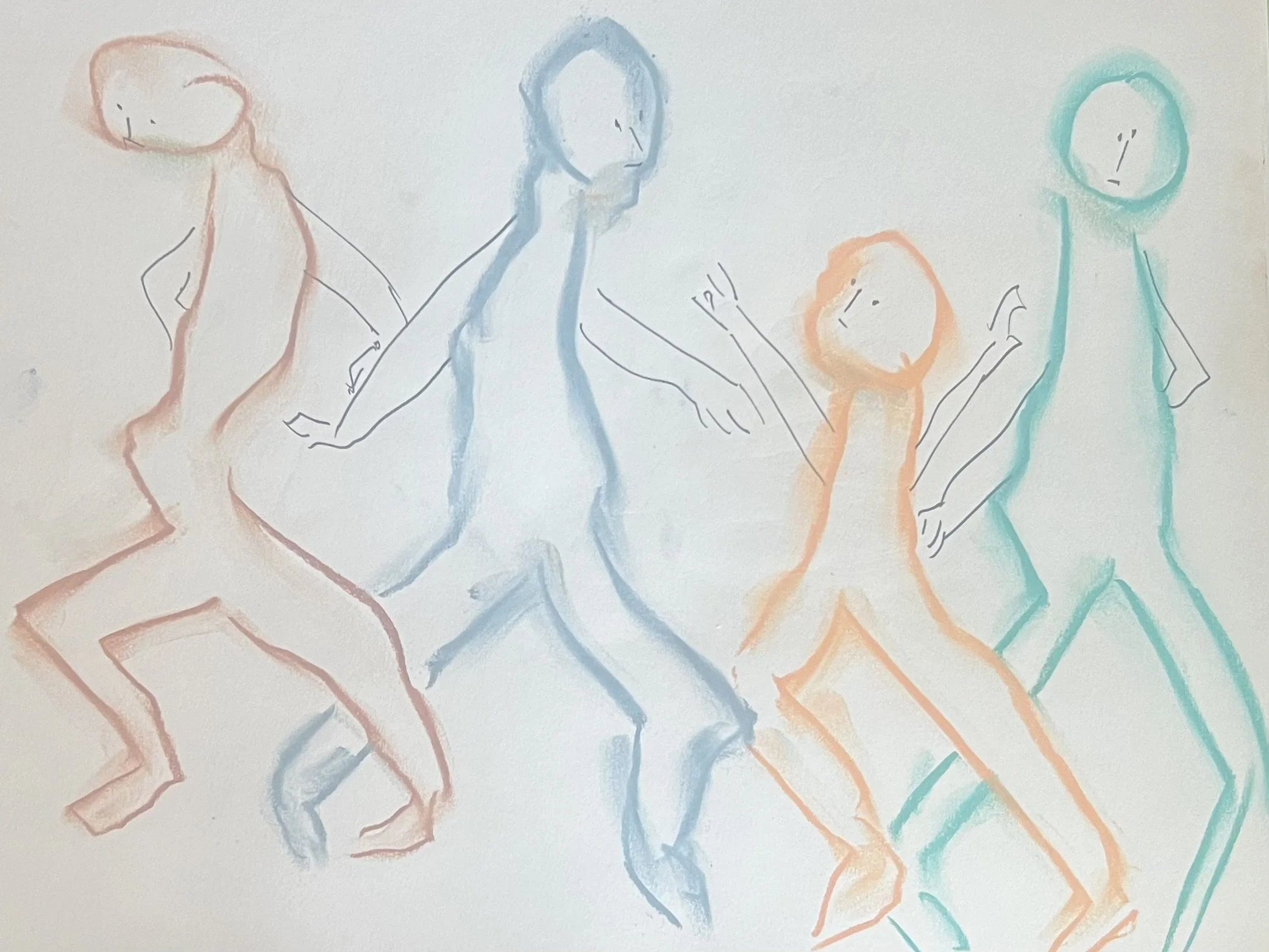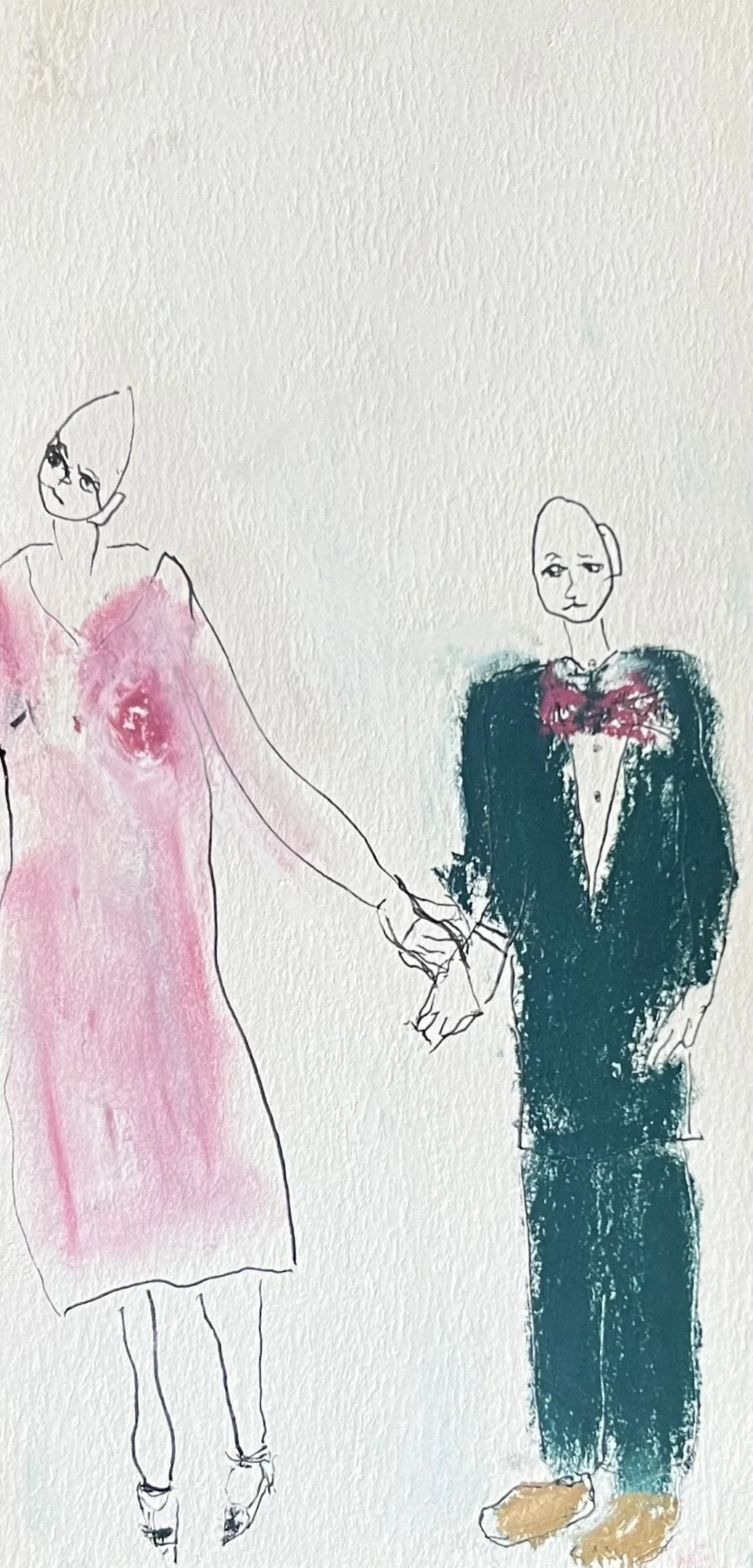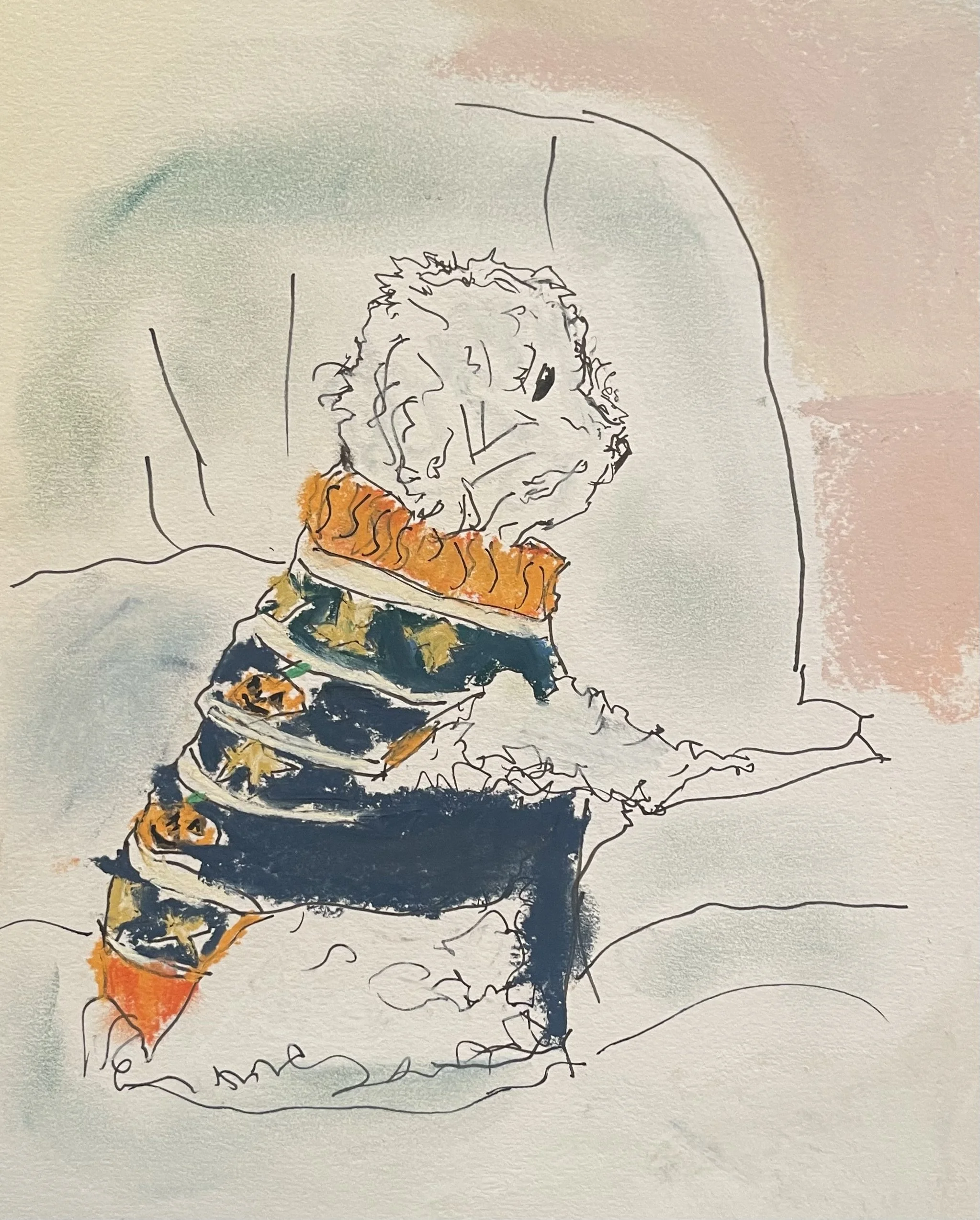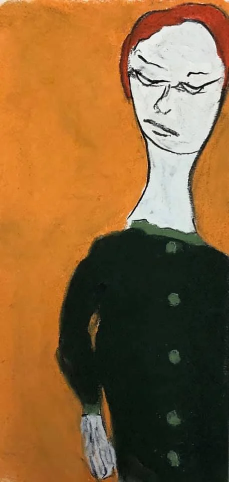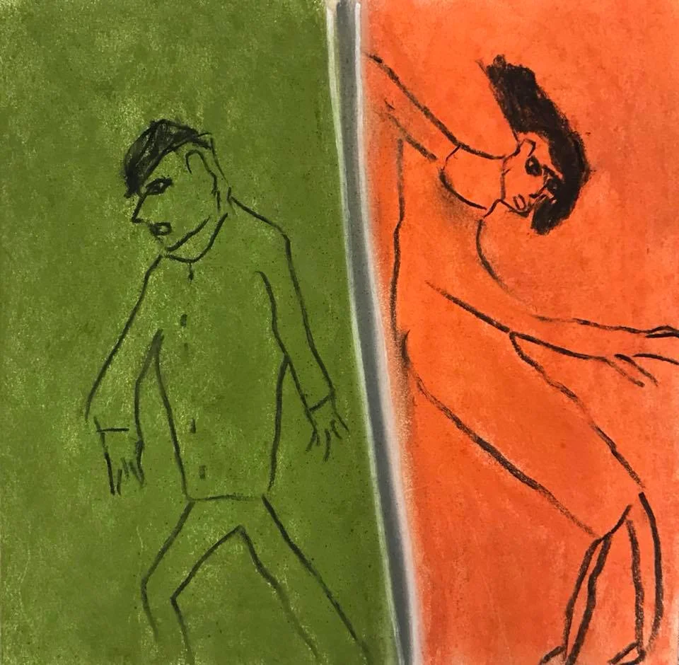 As the “about” page tells it, these come to Gary almost after the fact. A line and or stroke of color is placed on the page and often suggests what the next line or color will be, always in a depiction of one or more people. However, he can also be inspired whimsically by his environment; as one might see figures and faces in bathroom wallpaper, his eye might catch the corner of a screen window or a half-reflection in a mirror and shapes will be seen and a new drawing, a new person, suggested. Or he might be fancying a color—bright orange, let’s say—or a shape—a raised eyebrow-perhaps—and start from that slight preconception.