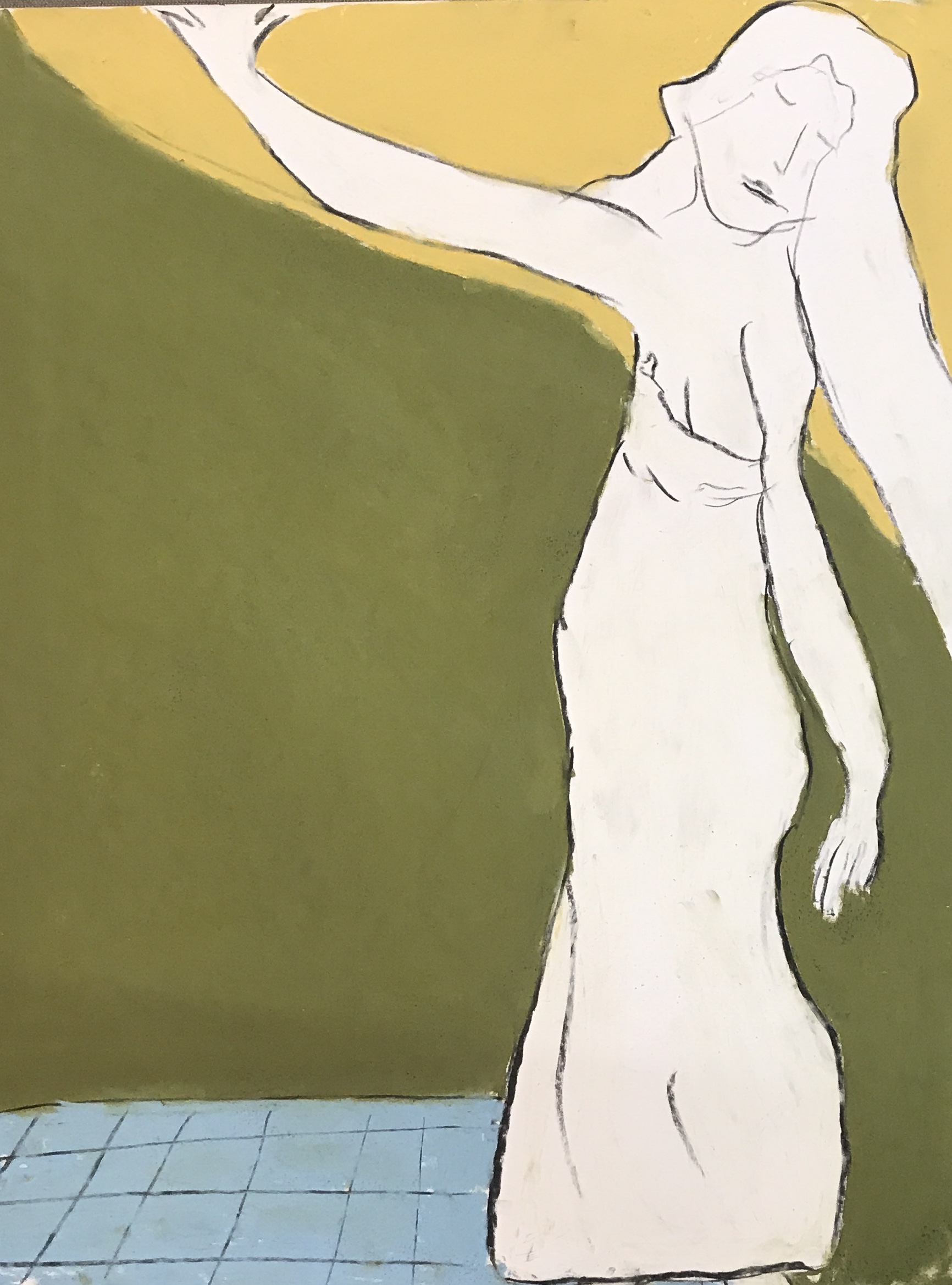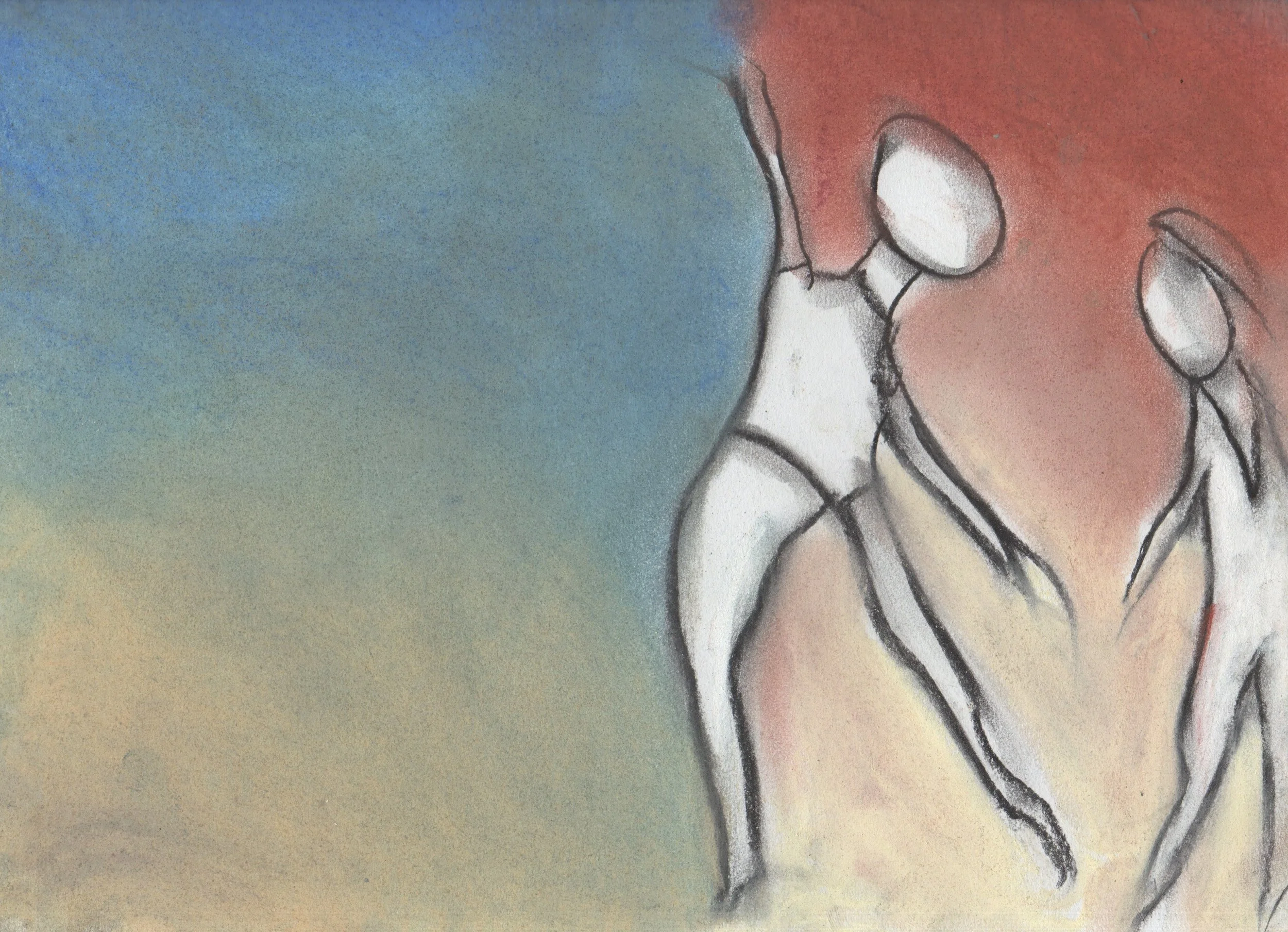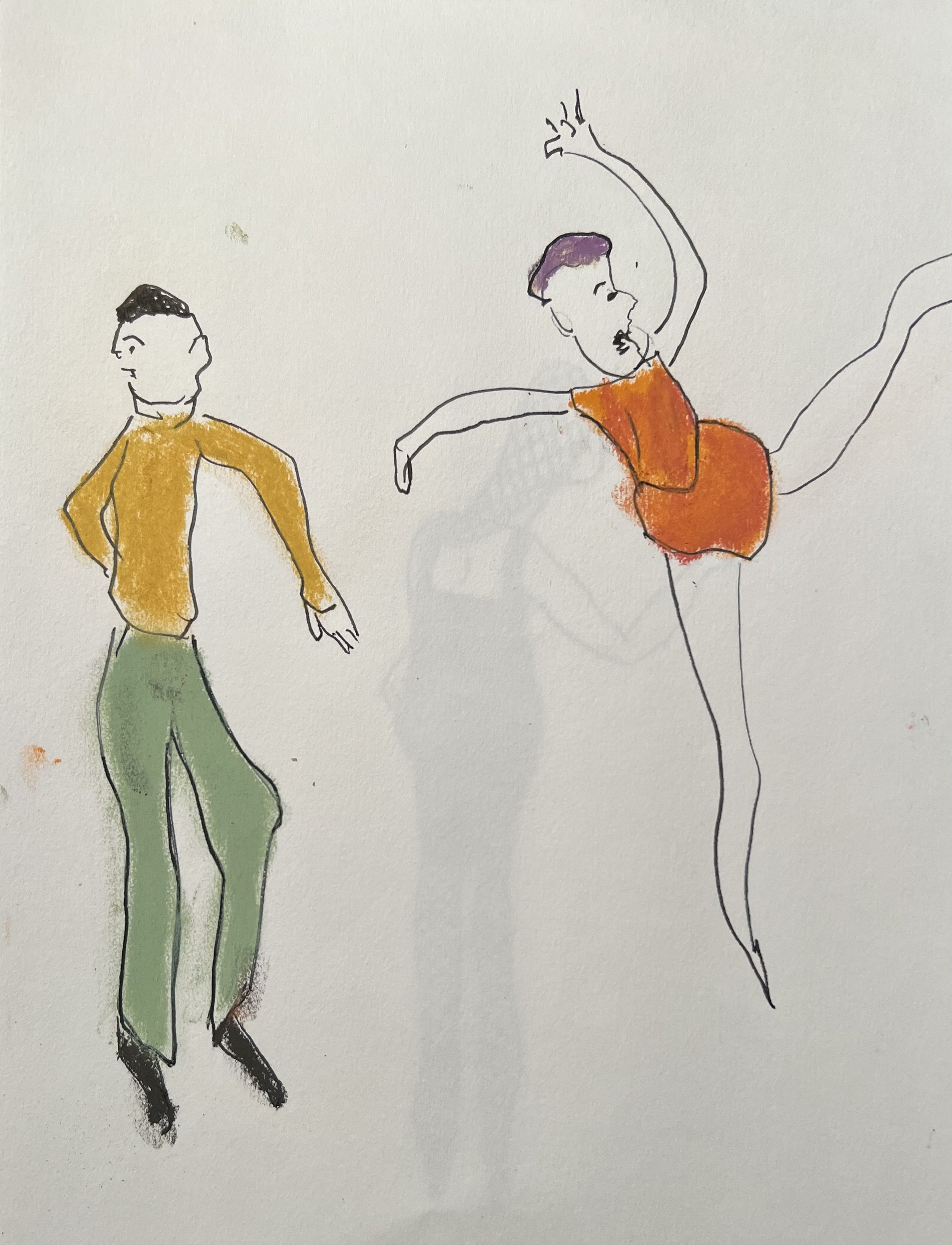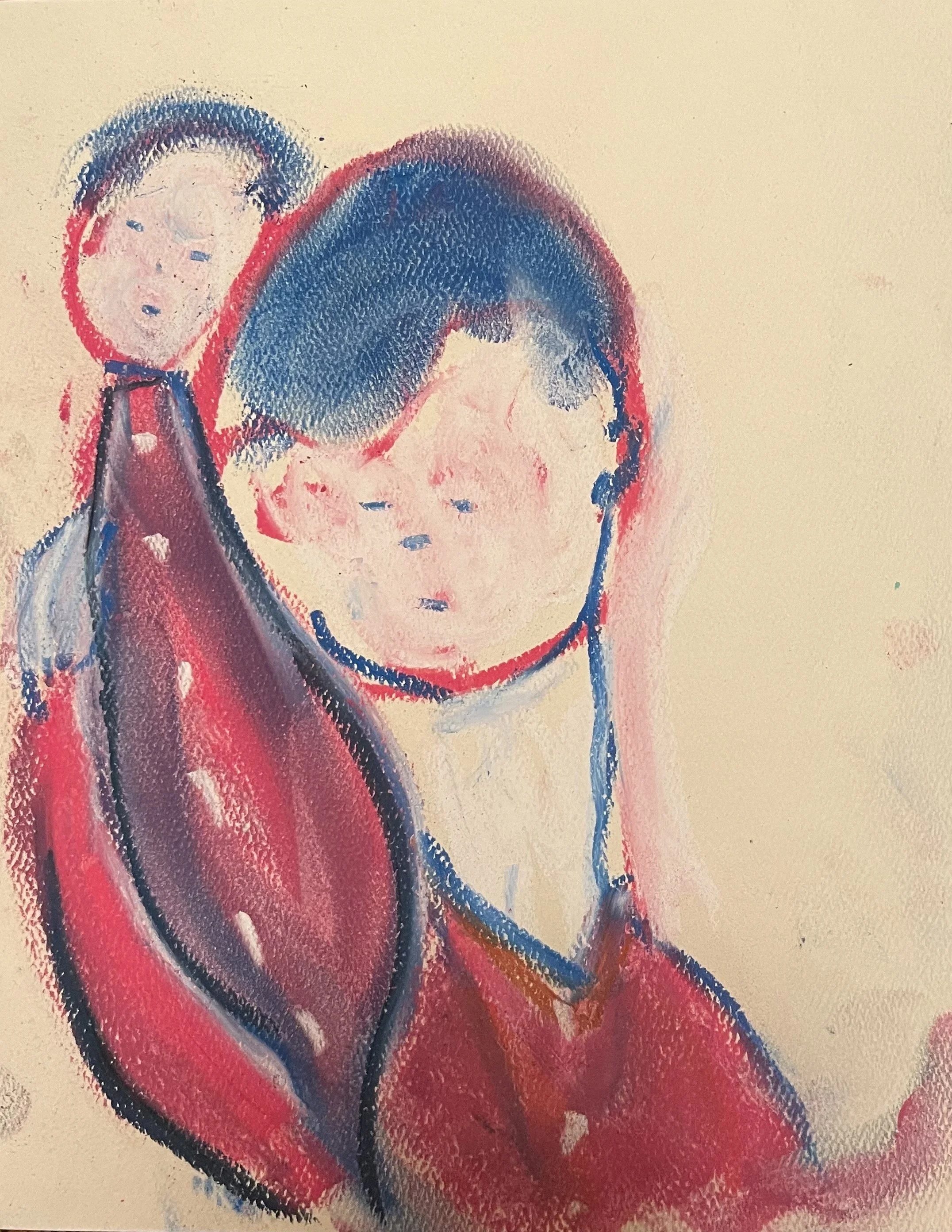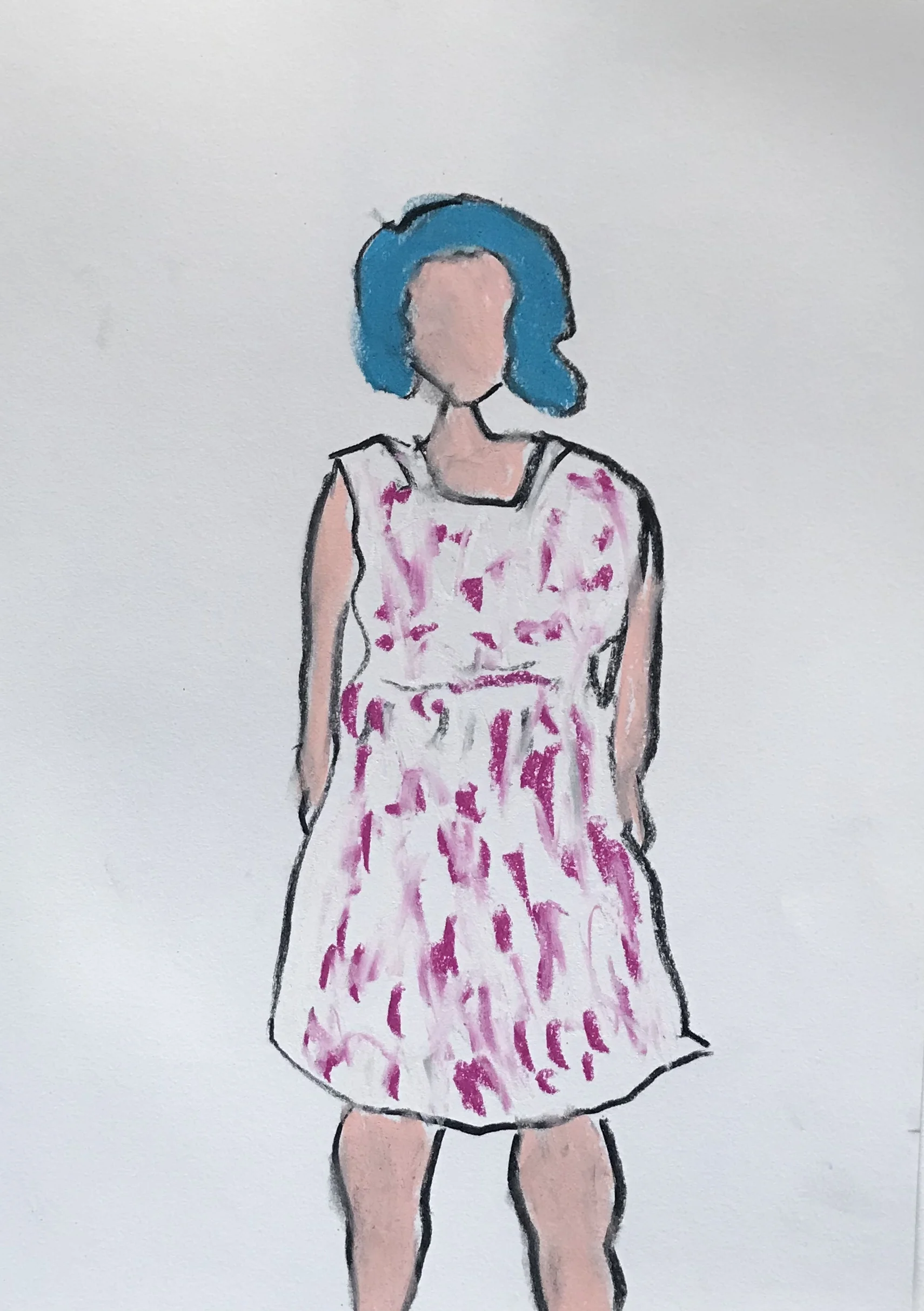 As the “about” page tells it, these come to Gary almost after the fact. A line and or stroke of color is placed on the page and often suggests what the next line or color will be, always in a depiction of one or more people. However, he can also be inspired whimsically by his environment; as one might see figures and faces in bathroom wallpaper, his eye might catch the corner of a screen window or a half-reflection in a mirror and shapes will be seen and a new drawing, a new person, suggested. Or he might be fancying a color—bright orange, let’s say—or a shape—a raised eyebrow-perhaps—and start from that slight preconception.