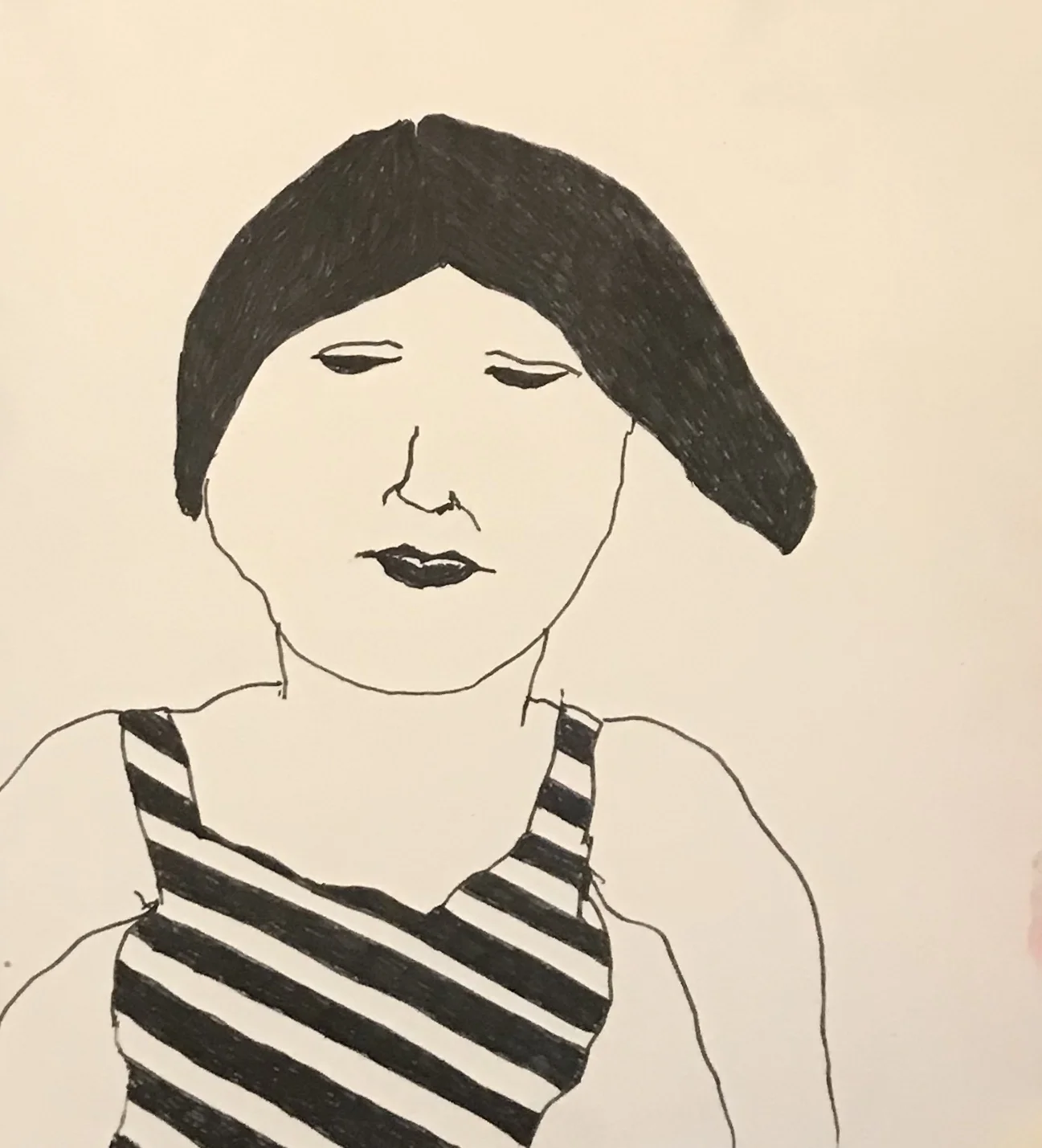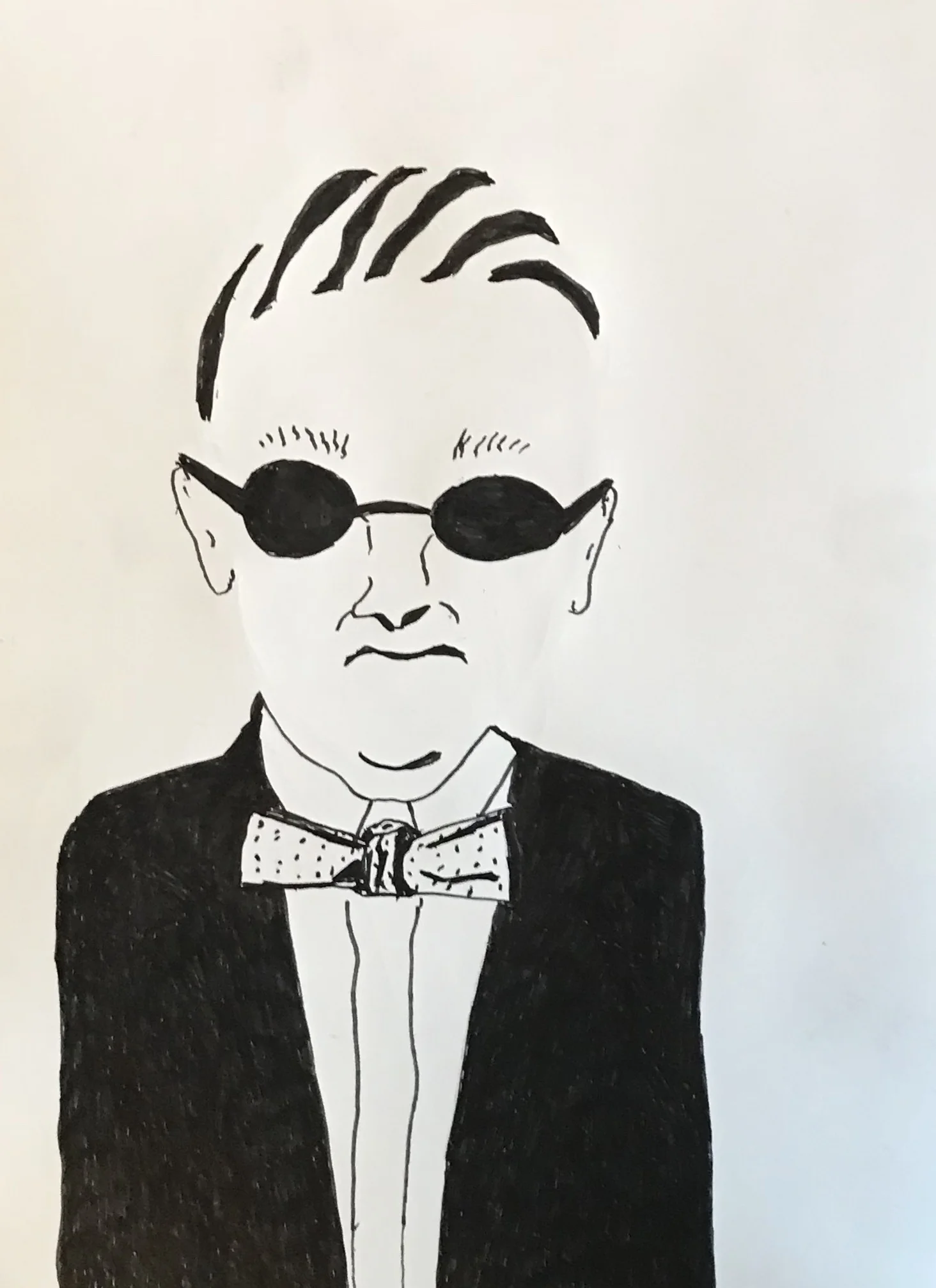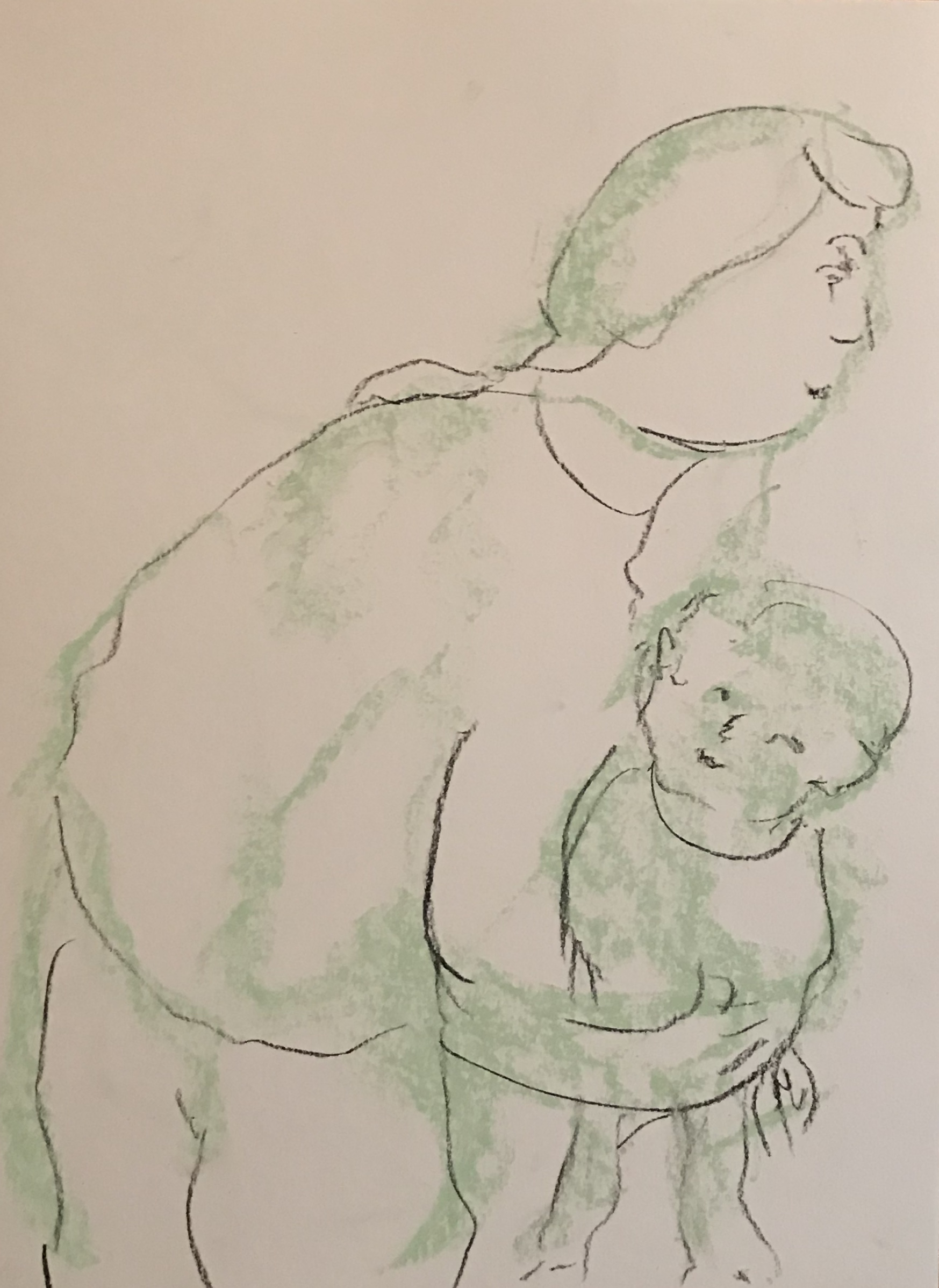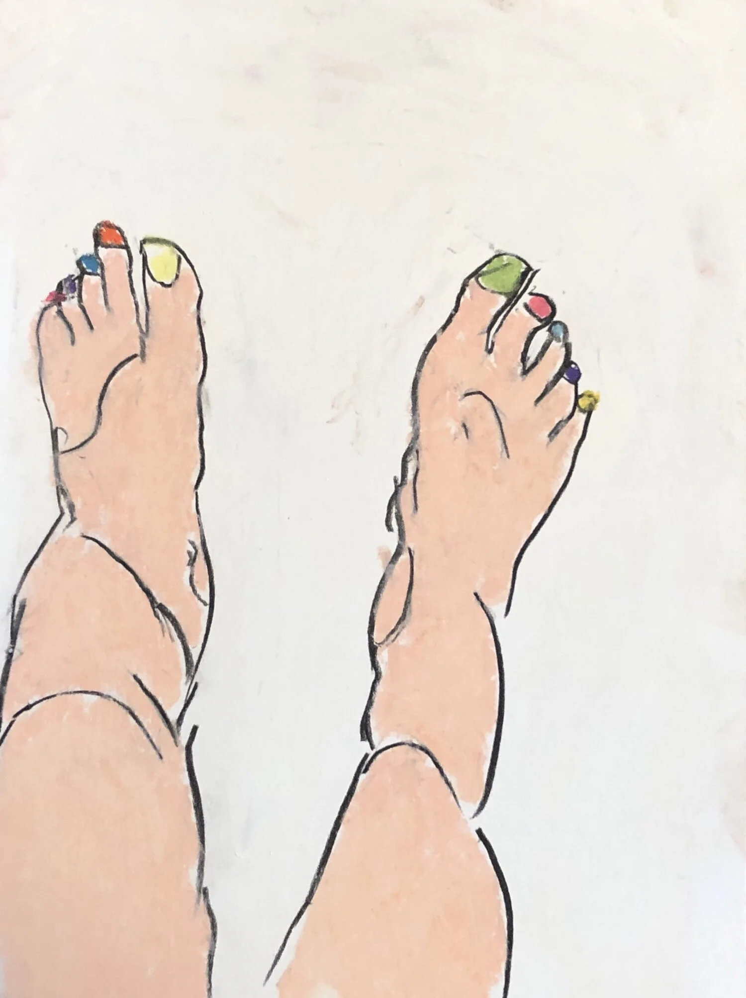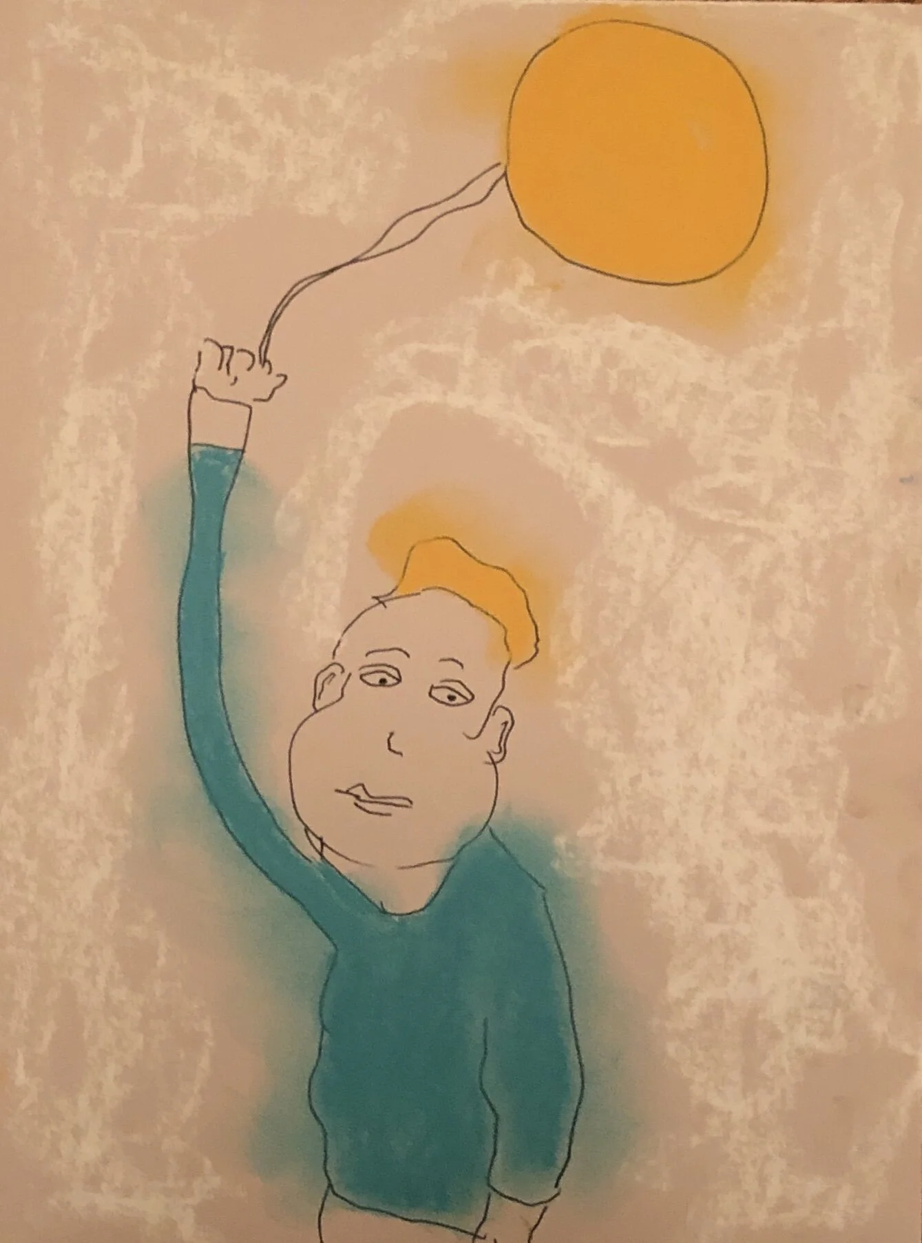 As the “about” page tells it, these come to Gary almost after the fact. A line and or stroke of color is placed on the page and often suggests what the next line or color will be, always in a depiction of one or more people. However, he can also be inspired whimsically by his environment; as one might see figures and faces in bathroom wallpaper, his eye might catch the corner of a screen window or a half-reflection in a mirror and shapes will be seen and a new drawing, a new person, suggested. Or he might be fancying a color—bright orange, let’s say—or a shape—a raised eyebrow-perhaps—and start from that slight preconception.